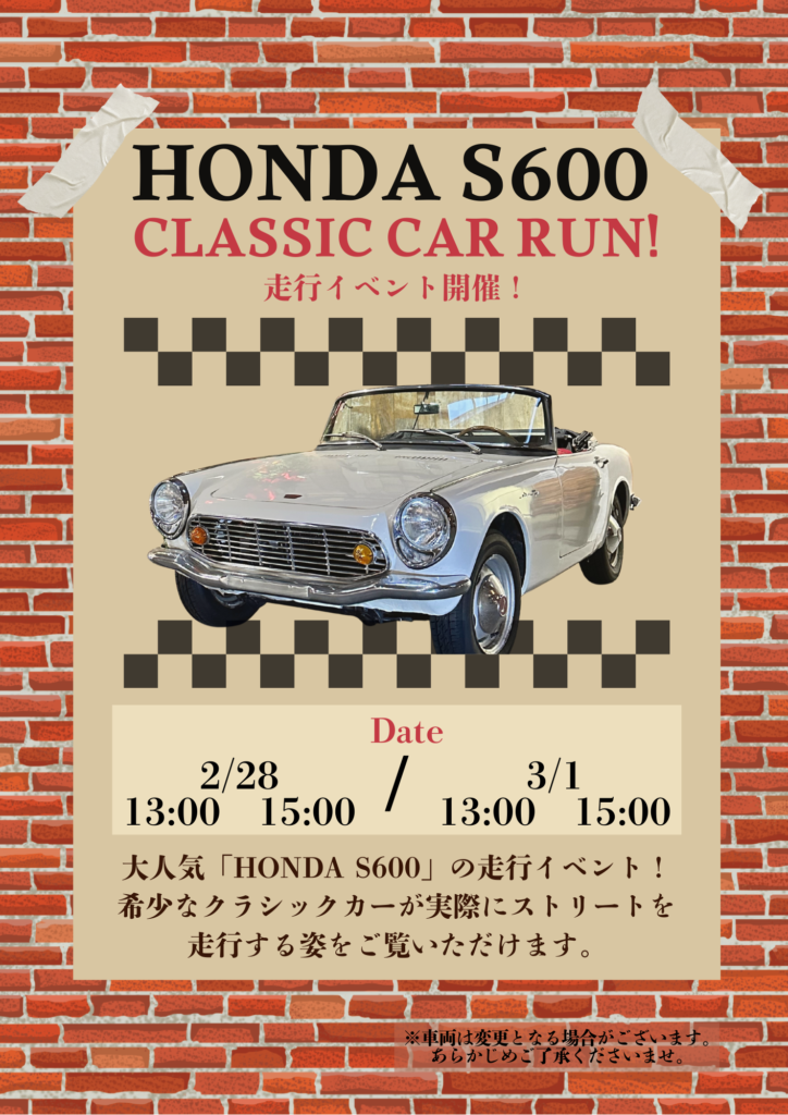 さらに、2/28、3/1の2日間限定でHONDA S600の走行イベントを開催いたします!
